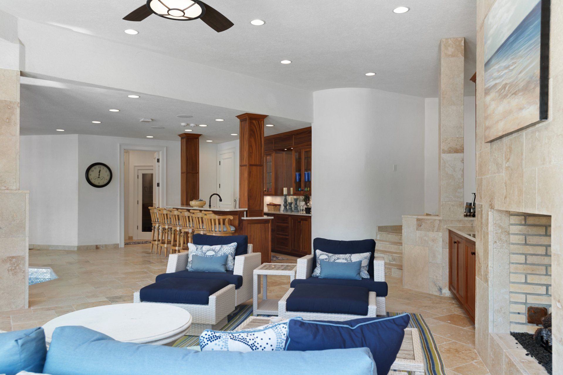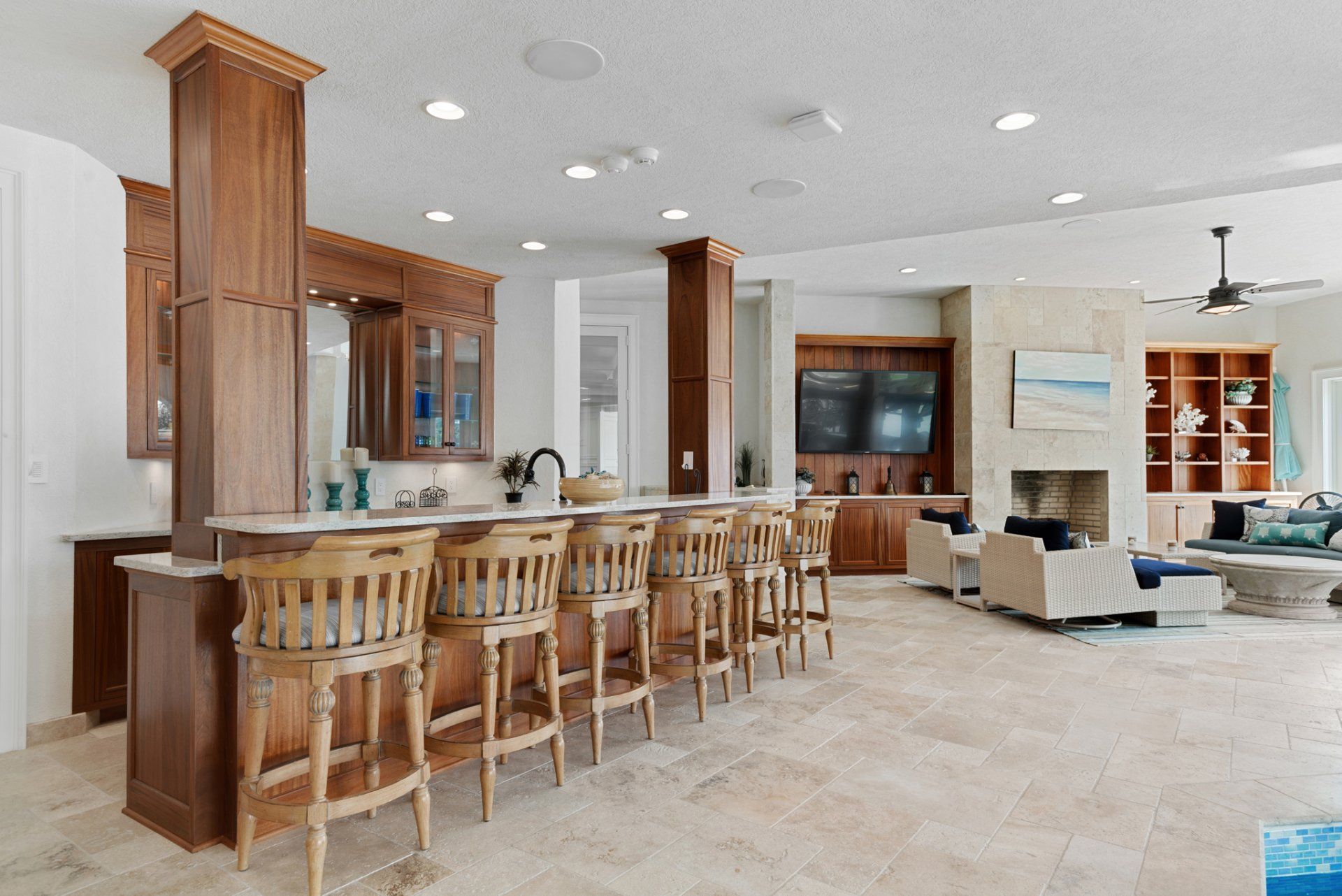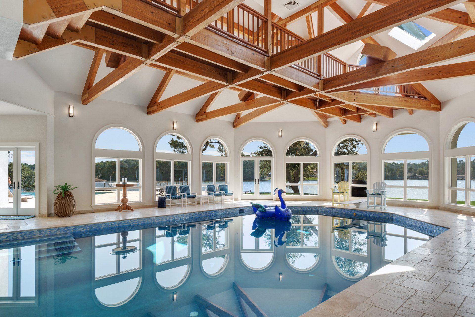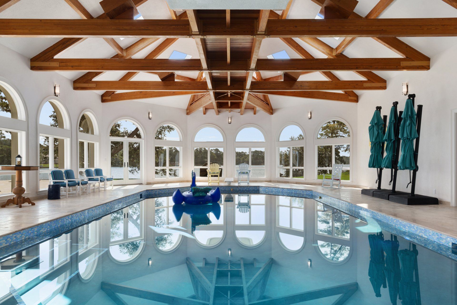 - Floor to ceiling windows overlooking water and pool deck, crowned with paladian arches