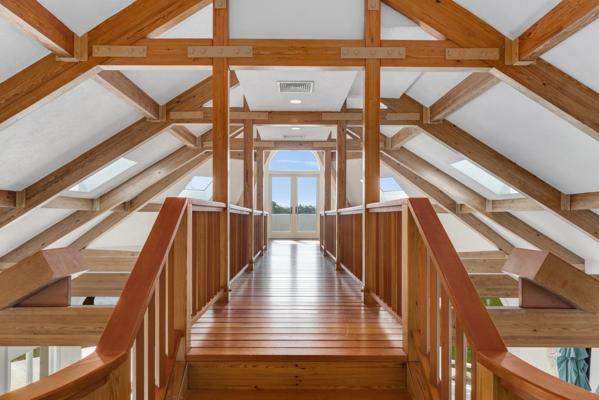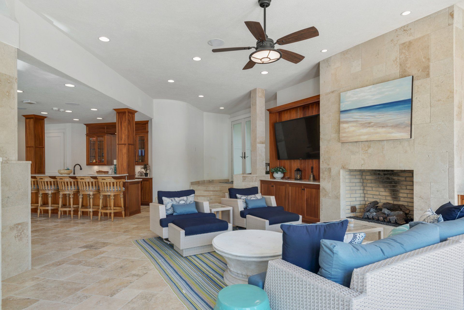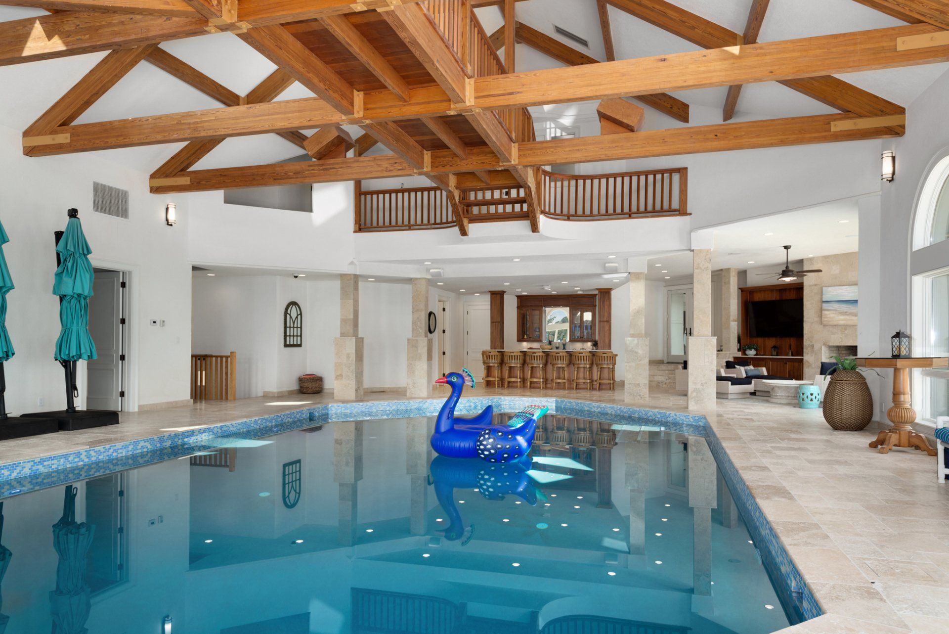 - Floor to ceiling windows overlooking water and pool deck, crowned with paladian arches