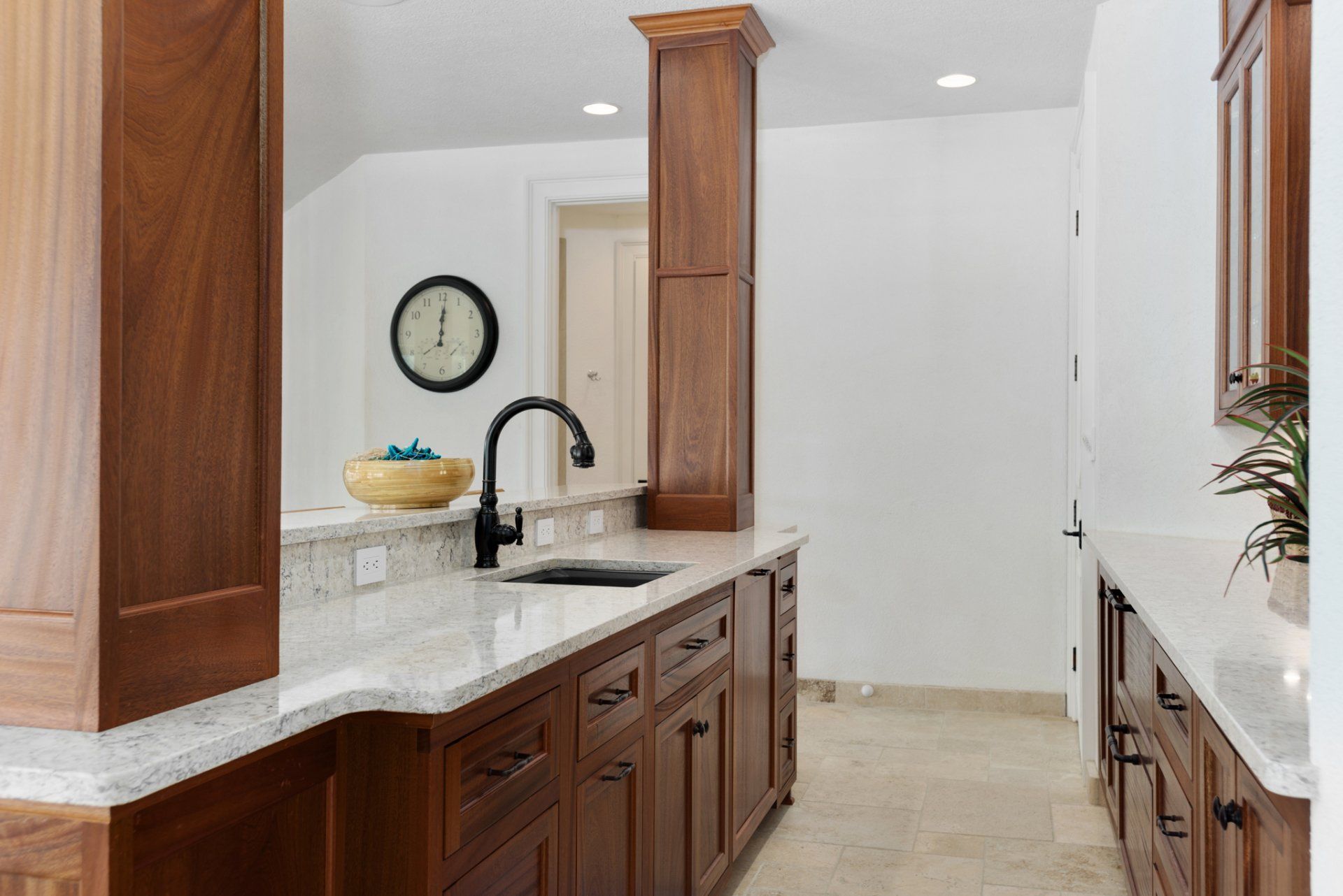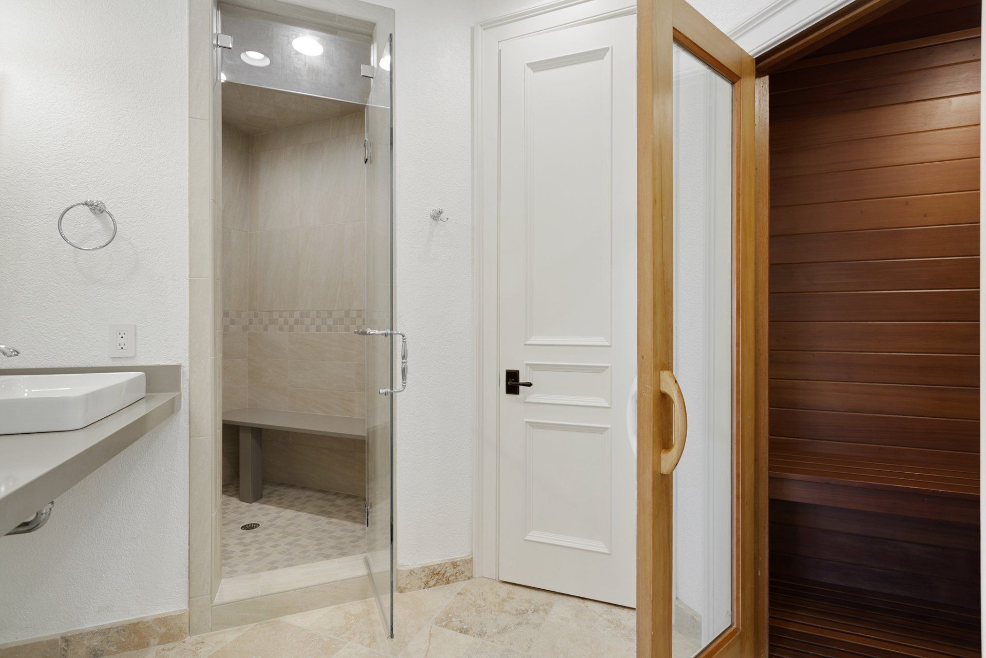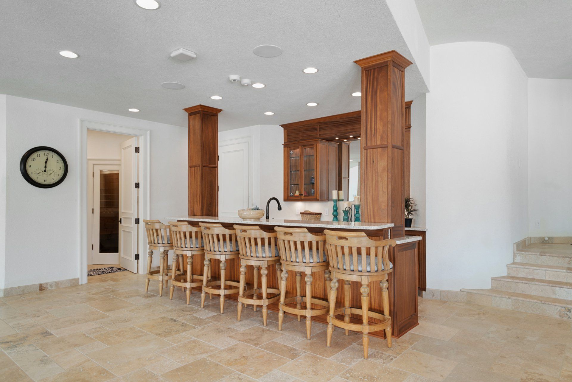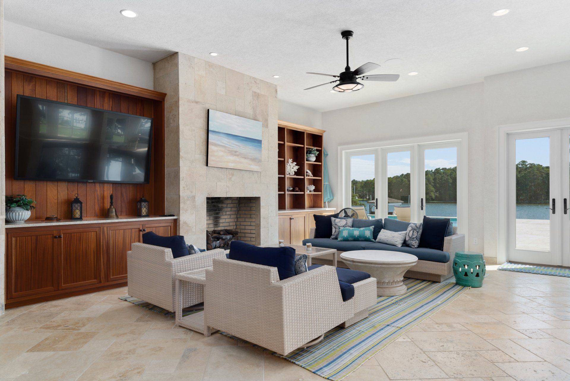 - Floor to ceiling windows overlooking water and pool deck, crowned with paladian arches