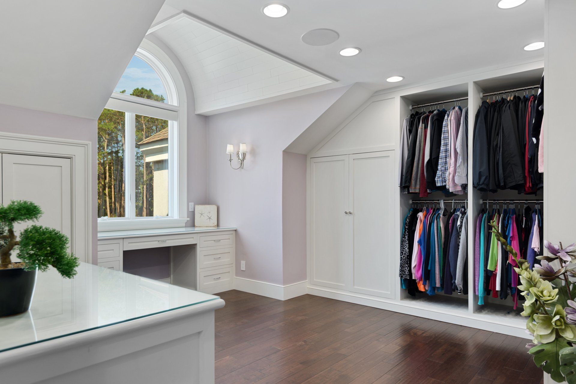 - Two couture closets with grasscloth accent walls, tongue and groove arched ceiling