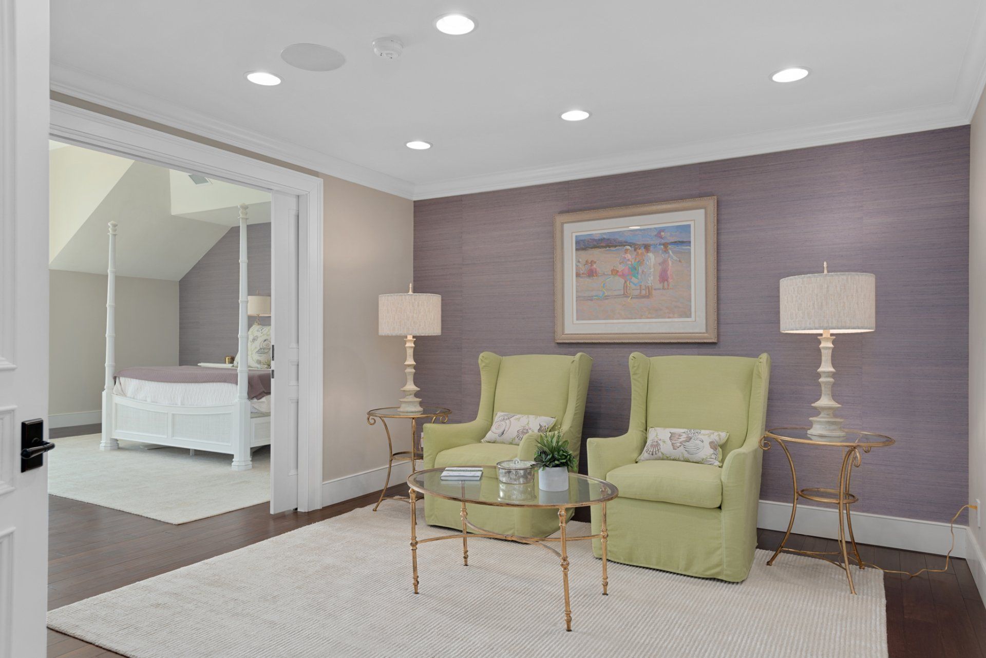 - Sitting area with wet bar and beverage station separates from bedroom with pocket doors