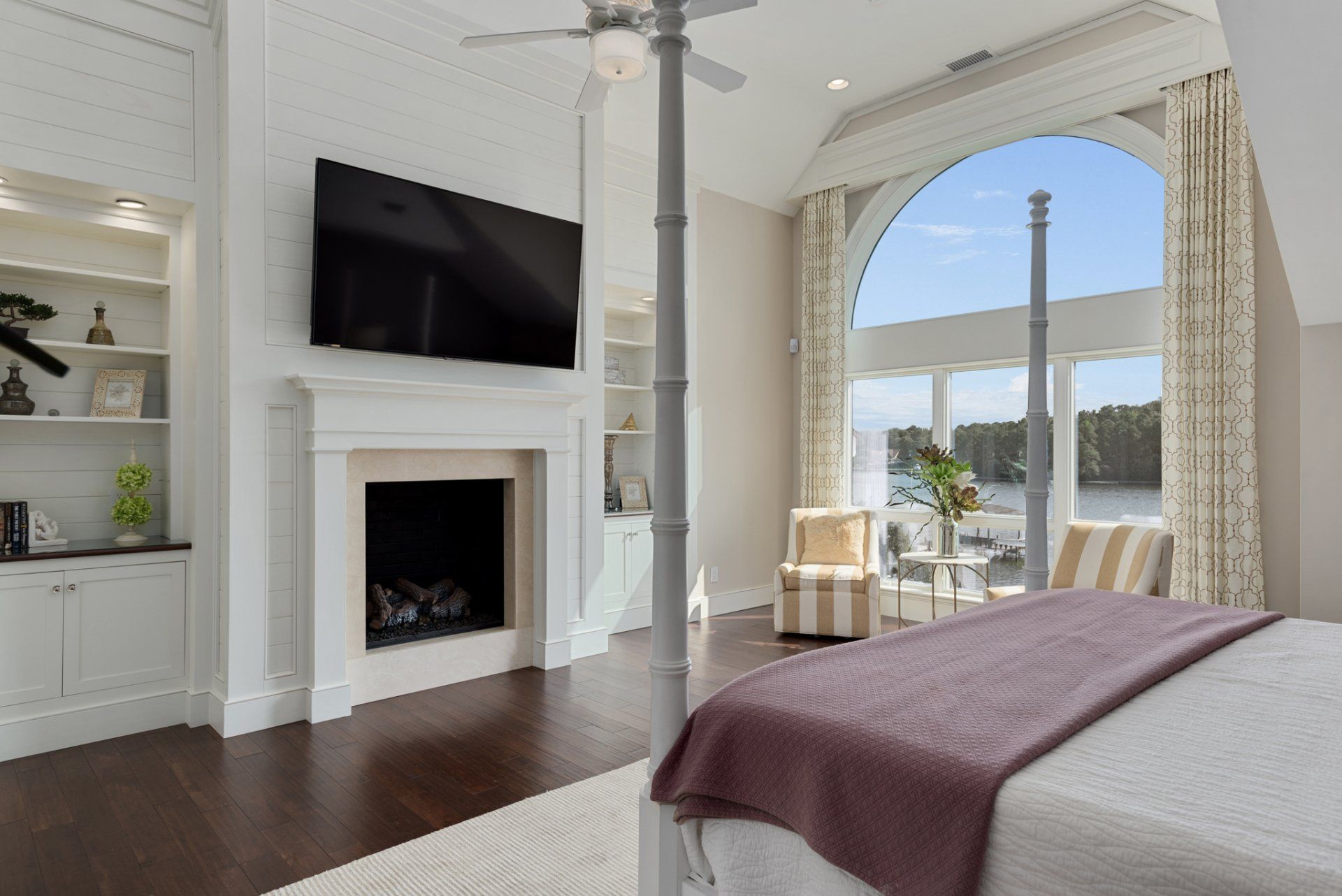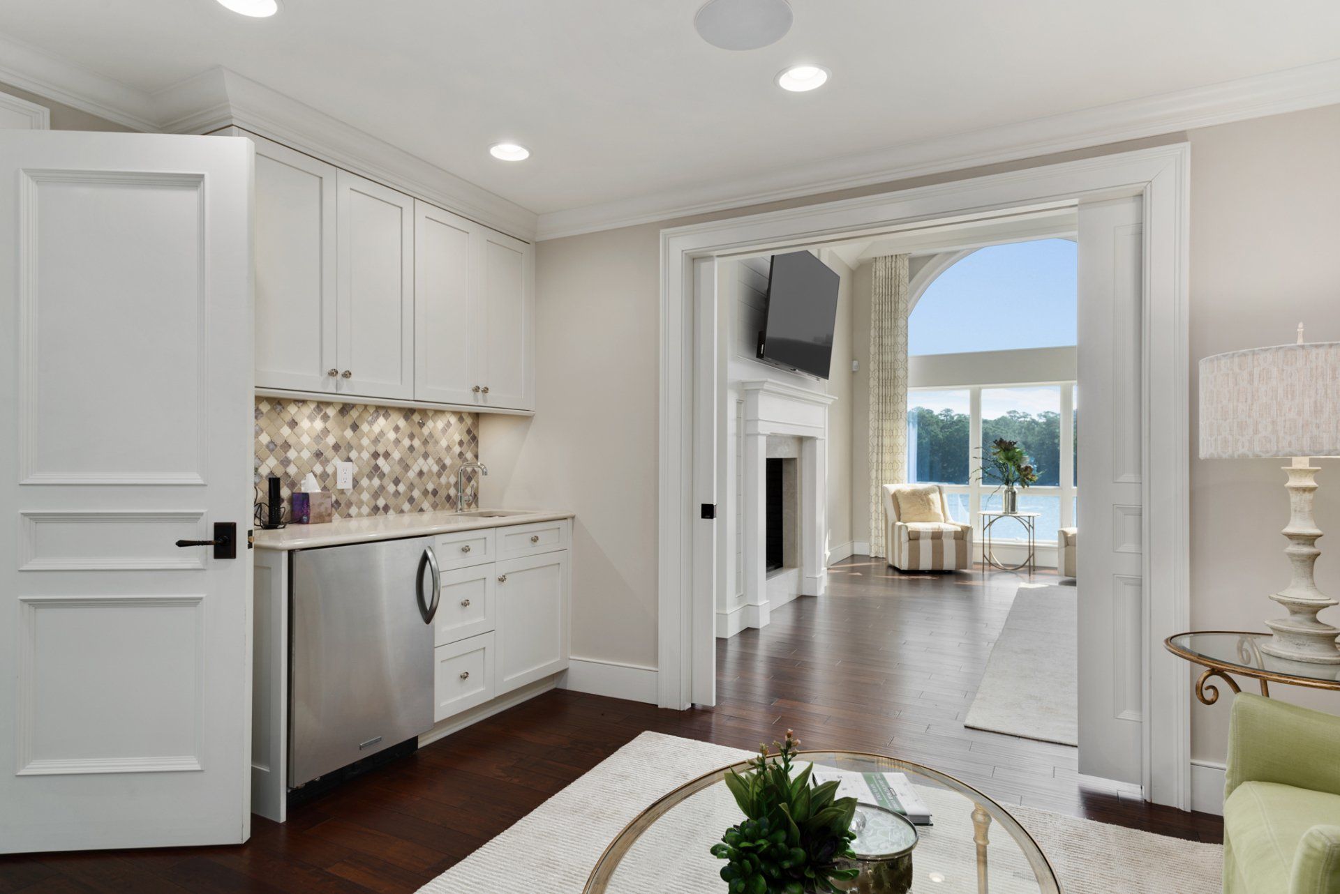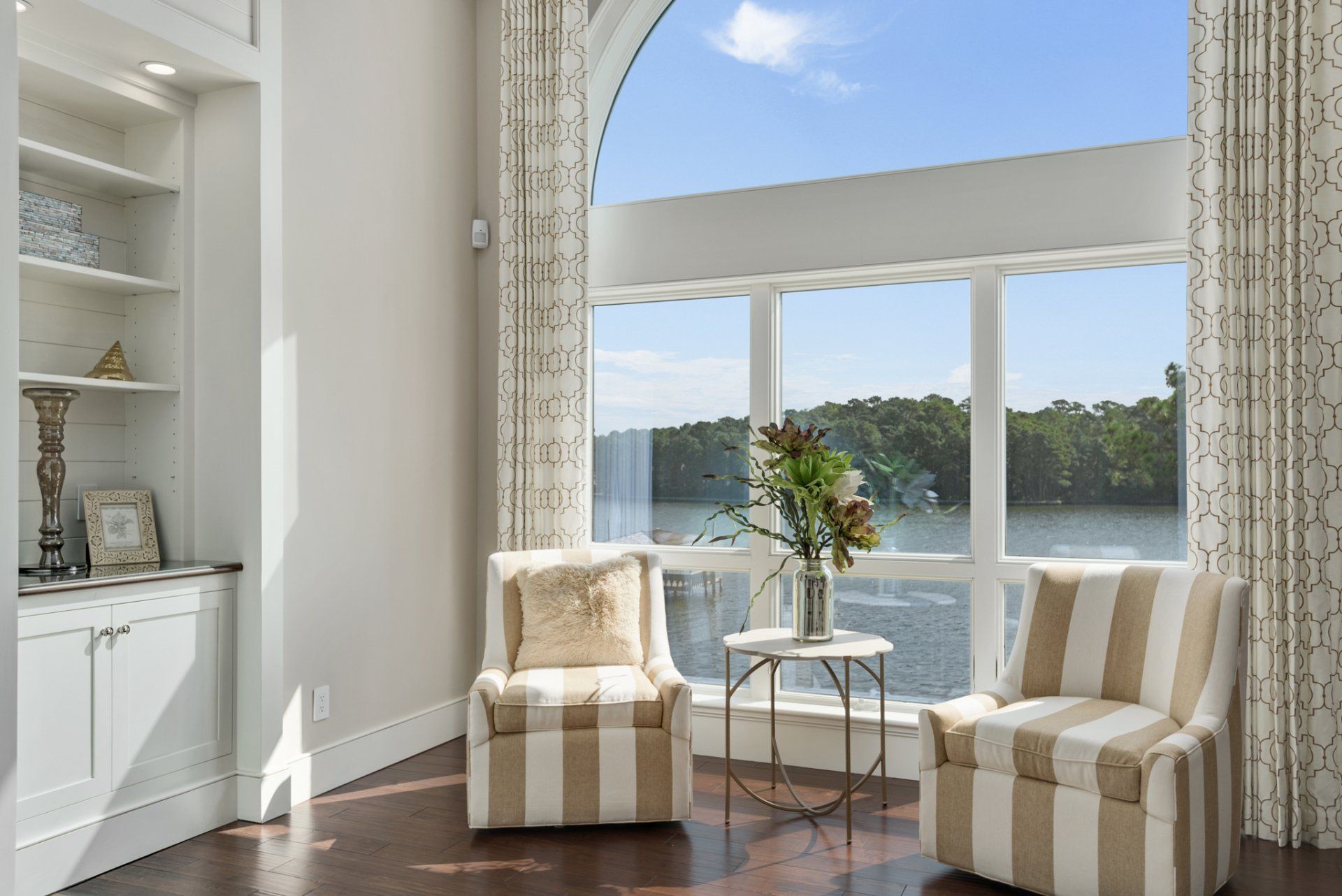- Floor to ceiling windows with palladian crown offers view of water and pool